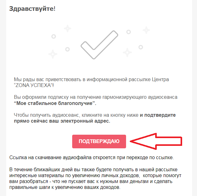 Чтобы получить обещанный аудиосеанс “Мое стабильное благополучие”, зайдите сейчас в свой почтовый ящик, найдите сообщение от нас и подтвердите свое согласие получать наши сообщения по e-mail. После этого на почту поступит письмо со ссылкой на аудиосеанс.