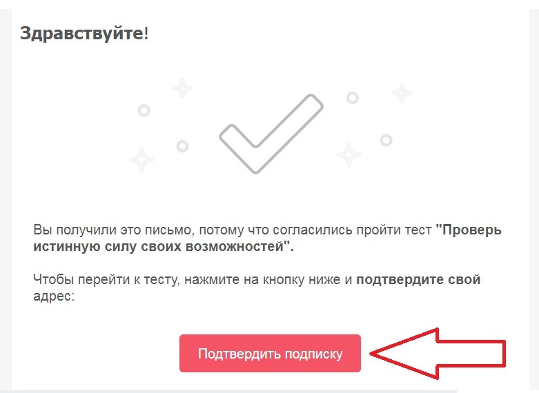 Чтобы получить ссылку на тест “Желай и материализуй”, зайдите сейчас в свой почтовый ящик, найдите сообщение от нас и подтвердите свое согласие получать наши сообщения по e-mail. После этого на почту поступит письмо со ссылкой на тест и последующее отдельное письмо со специальным бонусом - аудиосеанс “Мое стабильное благополучие”